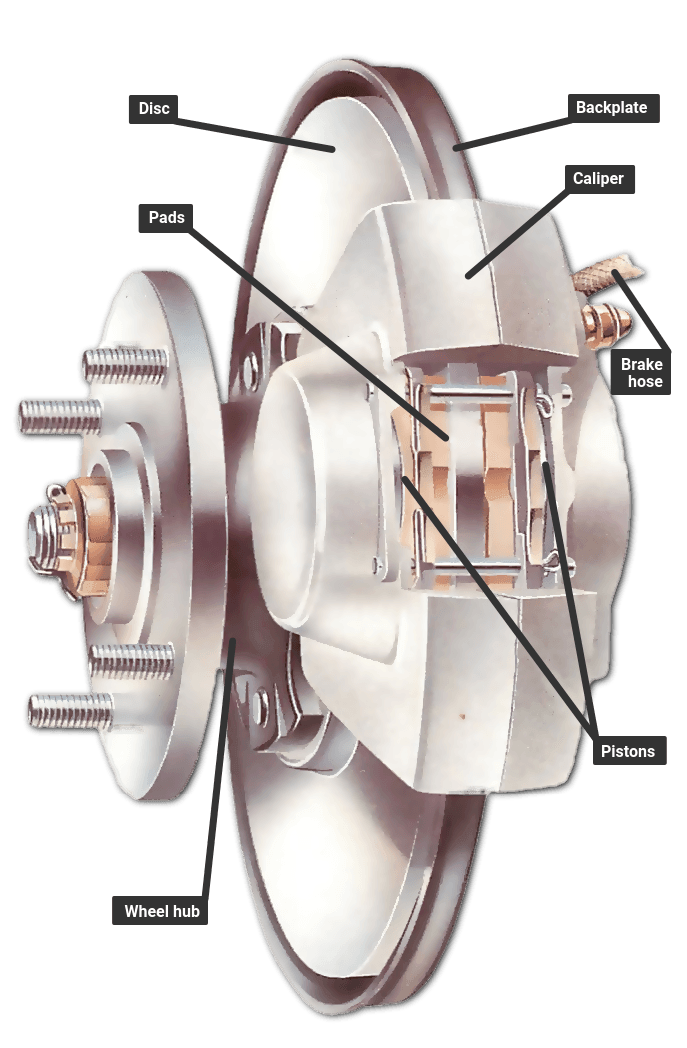 A brake disc has a disc that turns with the wheel. The disc is straddled by a caliper, in which there are small hydraulic pistons worked by pressure from the master cylinder. The pistons press on friction pads that clamp against the disc from each side to slow or stop it. The pads are shaped to cover a broad sector of the disc.