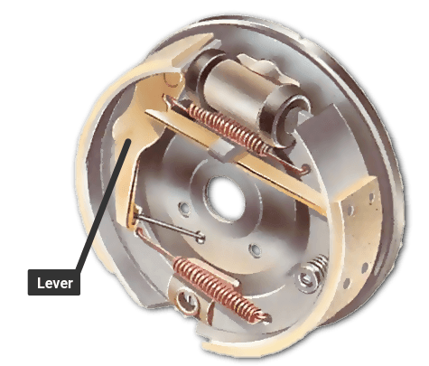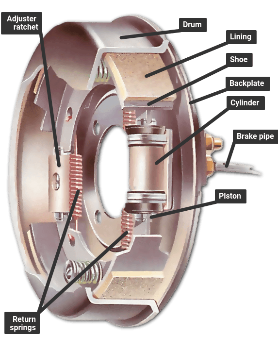 A drum brake has a hollow drum that turns with the wheel. The open back is covered by a backplate on which there are two curved shoes carrying friction linings. The shoes are forced outwards by hydraulic pressure moving pistons in the brake’s wheel cylinders which presses the linings against the inside of the drum to slow or stop it.