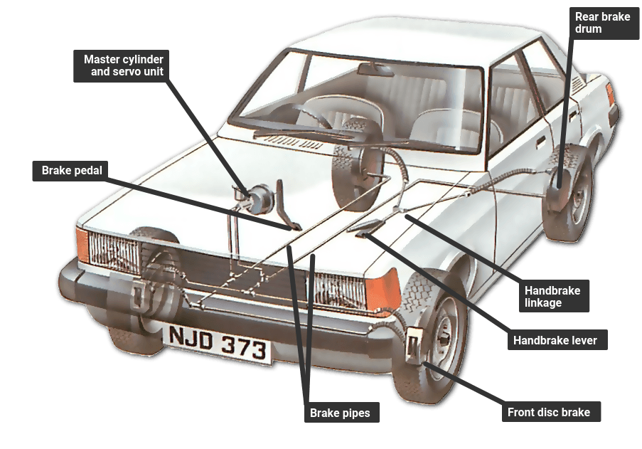 A typical dual-circuit braking system acts on both front wheels and one rear wheel. Pressing the brake pedal forces fluid out of the master cylinder along the brake pipes to the slave cylinders at the wheels; the master cylinder has a reservoir that keeps it full.