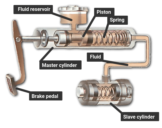 Pushing the brake pedal depresses a piston in the master cylinder which forces fluid along the pipe. The fluid travels to slave cylinders at each wheel and fills them, forcing pistons out to apply the brakes. Fluid pressure distributes itself evenly around the system. The combined surface ‘pushing’ area of all the slave pistons is much greater than that of the piston in the master cylinder. As a result the master piston has to travel several inches to move the slave pistons the fraction of an inch it takes to apply the brakes. This arrangement allows great force to be exerted by the brakes in the same way that a long-handled lever can easily lift a heavy object a short distance.
