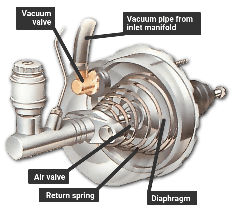 The brake pedal also works on a set of air valves, and there is a large rubber diaphragm connected to the master cylinder piston. When the brakes are off, both sides of the diaphragm are exposed to the vacuum from the manifold. Pressing the brake pedal closes the valve linking the rear side of the diaphragm to the manifold, and opens a valve that lets in air from outside. The pressure of the outside air forces the diaphragm forward to push on the master cylinder piston which assists the braking effort.